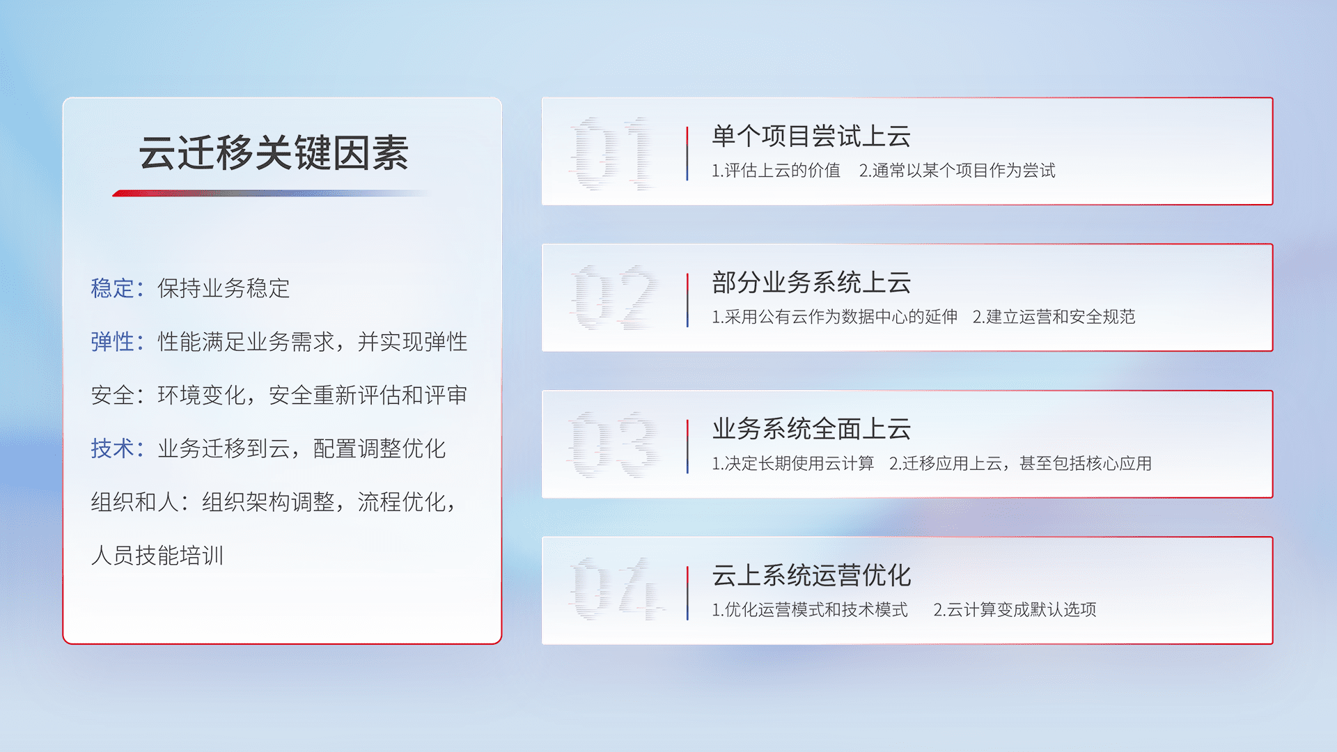 结合实际业务,,,从规划设计、、、云平台选型、、、、云原生改造、、、数据迁移、、、集成交付,,迁移全过程为客户识别最佳上云路径,,,,做好风险识别管理,,,设计网络架构、、、、身份权限、、、、安全审计合规、、操作审计、、、、日志审计、、、监控告警策略、、多站点容灾设计等,,,对云上基础设施进行整体规划,,,,提升IT治理水平,,,,以满足弹性、、高可用、、高性能的需求。。。