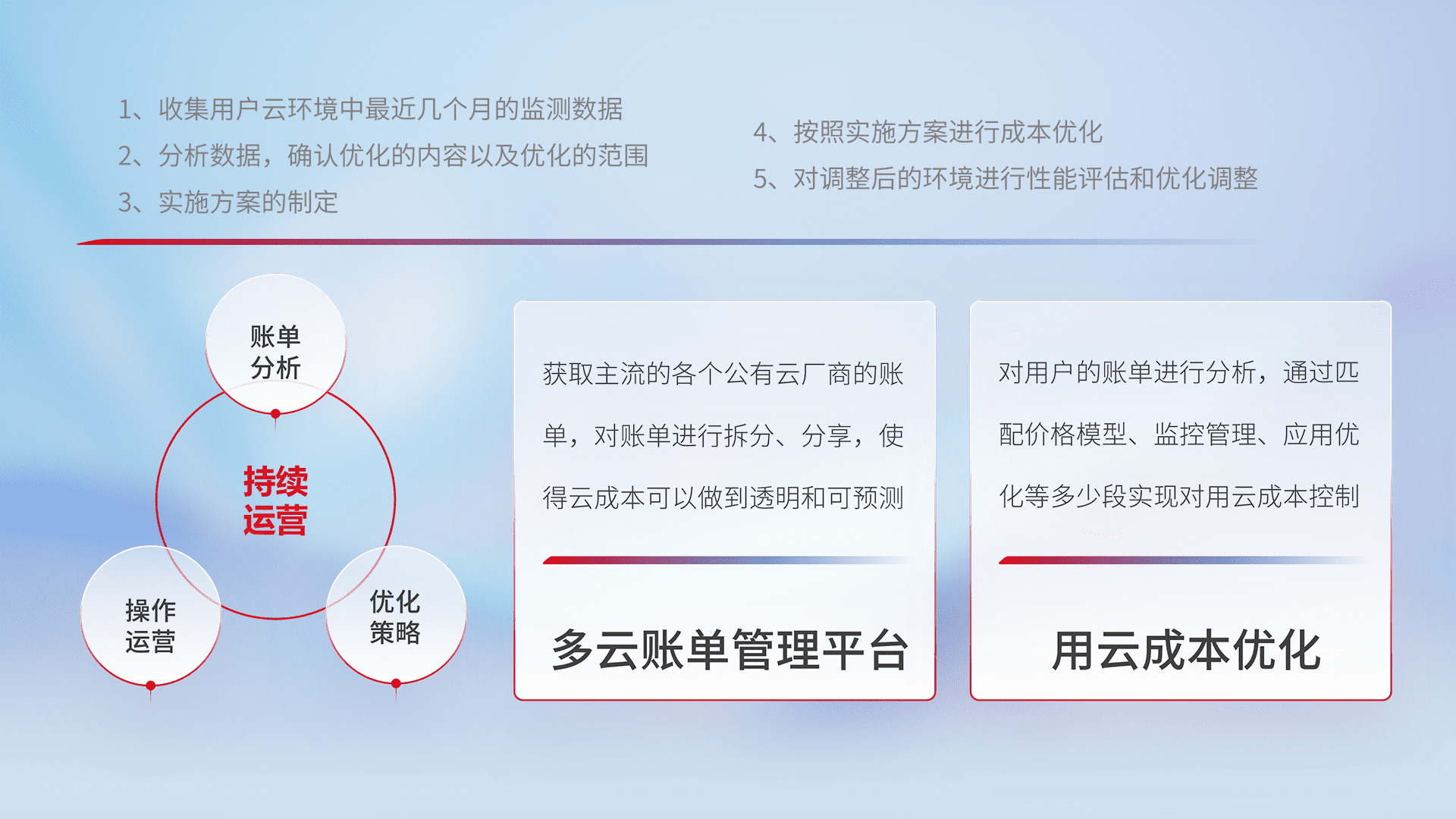 通过多云纳管,,,以统一的资源数据模型把客户的云资源进行抽象和封装,,,进而实现对多云资源的统一操作,,,,保障云资源管理的可靠性、、、稳定性与可用性。。量身定制化运维内容,,,配置、、、、开发运维、、、补丁管理、、、、备份、、、、监控、、、认证和访问管理、、、、审计和日常巡检等,,,保障在用云过程中的可靠度,,,,稳定度以及高可用率。。。