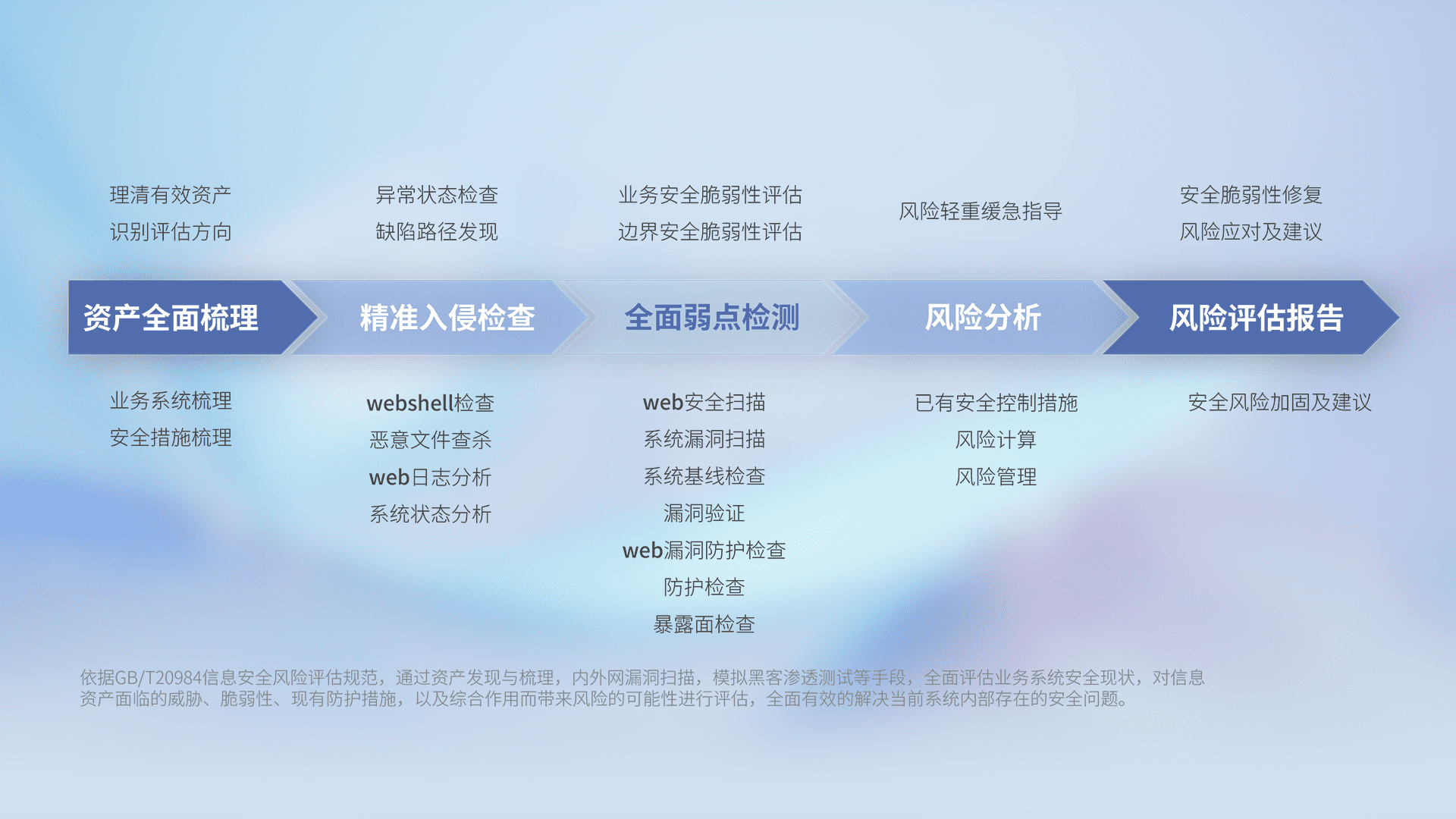 针对客户行业特性,,以专业的安全服务+多厂商联合解决方案提供专属的一站式安全管理服务,,,,帮助客户全面感知网络空间威胁,,基于识别、、检测、、、分析、、、、防护、、、、监测、、、、响应的服务理论模型,,,从方案咨询、、集成交付、、、评估验证、、、、优化加固、、、运维运营,,,,致力于为客户提供完整的闭环管理式安全服务。。。。以实战经验为客户打造高抵御风险的安全体系,,,,帮助客户发现威胁、、对抗威胁、、、处置威胁,,,不断积累安全对抗能力,,,,持续保障数字化安全。。