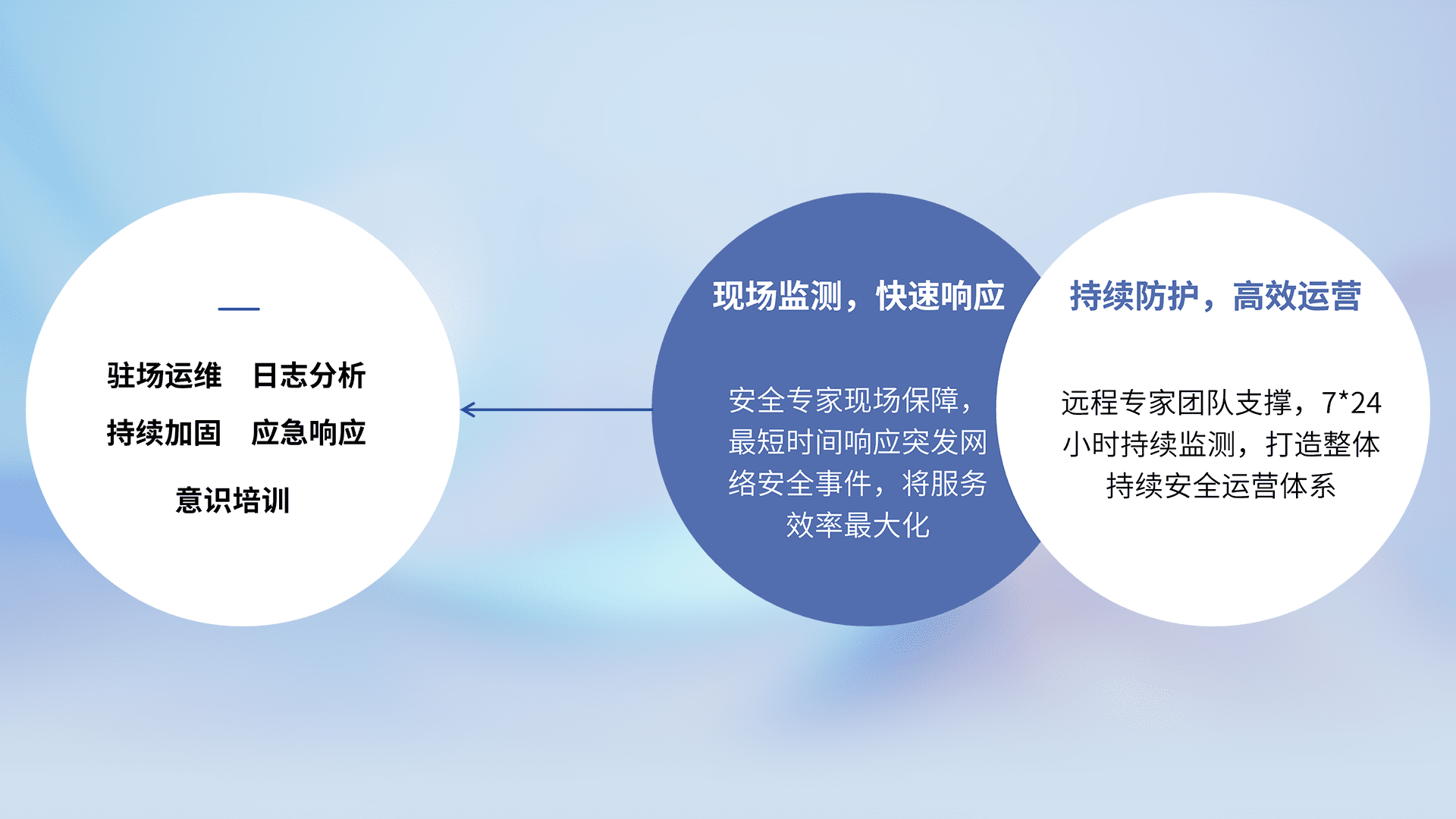 针对客户行业特性,,提供专属的一站式安全管理服务,,,,帮助客户全面感知网络空间威胁,,,,通过安全专家的线上、、、、线下防护支持,,,实现风险闭环,,,,将安全保障常态化,,,,为客户打造常态化安全运维运营服务。。